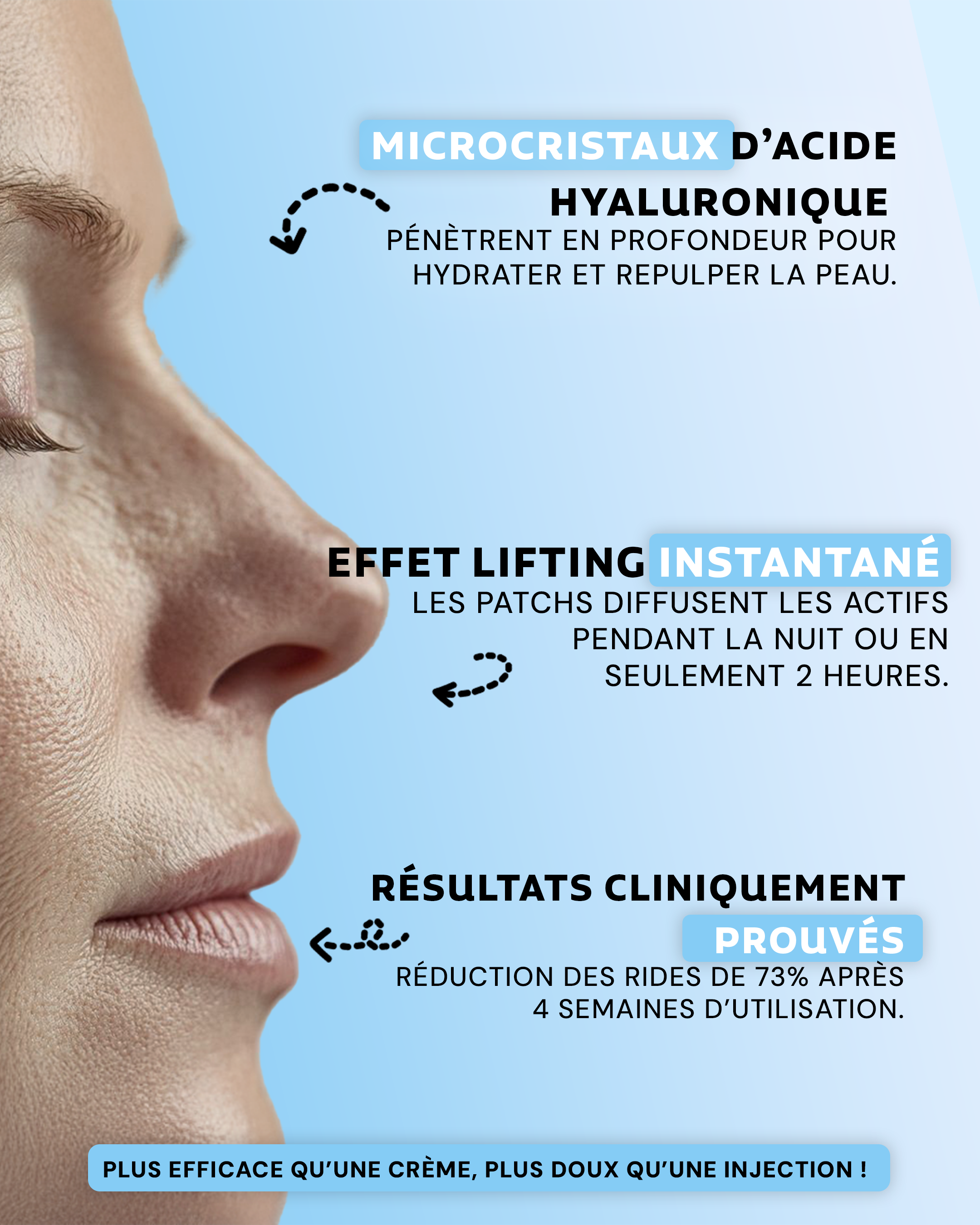 💡 Les patchs diffusent l’Acide Hyaluronique directement sous la peau, sans douleur, pour repulper et lisser les rides en quelques heures.